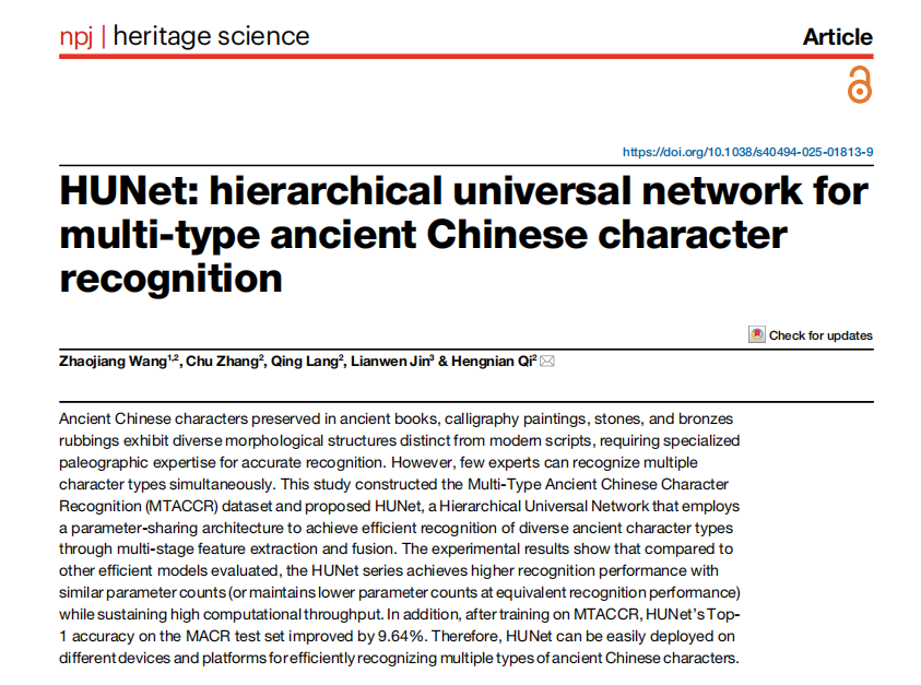 6月19日,Nature旗下期刊npjheritagescience在線發(fā)表我校人文學(xué)院數(shù)字人文專業(yè)博士生王釗江(指導(dǎo)教師吳夏平教授)與湖州師范學(xué)院、華南理工大學(xué)聯(lián)合開展的一項(xiàng)針對多樣化應(yīng)用場景古漢字識別的重要成果,題為“HUNet: hierarchical universal network for multi-type ancient Chinese character recognition”(https://www.nature.com/articles/s40494-025-01813-9)。論文提出了一種面向中國八體漢字識別的輕量化網(wǎng)絡(luò)模型。該模型針對書法掛畫、碑刻石刻、楹聯(lián)匾額等多樣化應(yīng)用場景,實(shí)現(xiàn)了對古代漢字的精準(zhǔn)高效識別。通過創(chuàng)新的網(wǎng)絡(luò)架構(gòu)設(shè)計(jì),模型在保證識別準(zhǔn)確率的同時顯著降低了計(jì)算復(fù)雜度,具備良好的跨平臺適配性,可靈活部署于各類終端設(shè)備。