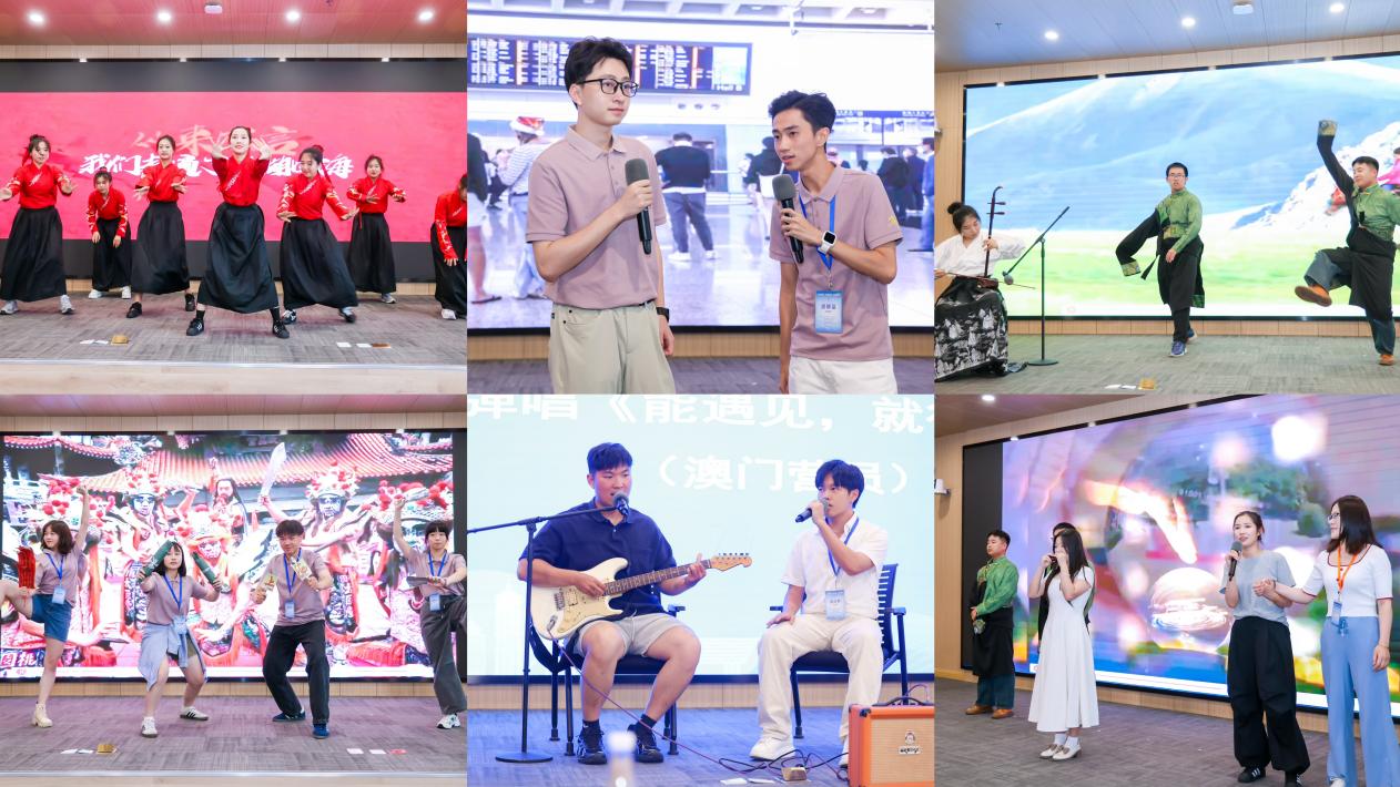 閉營儀式的風采展示環節,表演形式紛呈、四地文化薈萃、青年情誼綿長。我校教育學院志愿者以活力四射的國風舞蹈《山河圖》精彩開場,又壓軸表演了歌舞樂器串燒《賽馬》《友誼天長地久》,帶給大家視聽享受的同時傳遞著美好的期盼和祝愿。臺灣營員用舞臺劇《陣頭》講述了青年在傳統民俗表演的鼓舞下勵志成長的故事,表演獨特,直擊人心。澳門營員一曲吉他彈唱《能遇見,就很不錯了》,娓娓訴說相遇的珍貴和離別的不舍,悄然撥動眾人心弦。香港營員的《情緣永續》以時空穿越的情景演繹,發出“緣起浦江 情續香江”的誠摯邀請,讓大家不由心向往之。