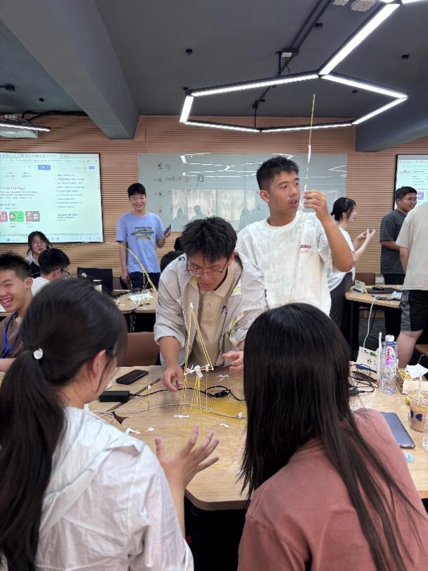 動手實驗挑戰,體驗創造樂趣。在動手實驗環節,營員們充分體驗了將理論付諸實踐的樂趣。在“意大利面高塔”挑戰中,各小組需利用有限的意大利面和膠帶來搭建盡可能高的穩定結構,這不僅考驗了同學們的結構學知識,更鍛煉了他們的團隊協作與工程設計能力。而在“多邊形輪子”項目中,同學們通過親手搭建和制作小汽車,讓它在特殊設計的“軌道”上平穩前行,深刻體會到數學原理在現實世界中的巧妙應用。