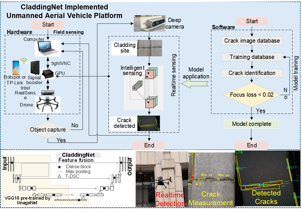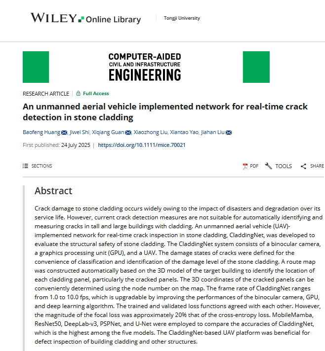 近日,我校建筑工程學院聯(lián)合信息與機電工程學院在土木工程領域頂刊Computer-Aided Civil and Infrastructure Engineering(期刊縮寫:Comput-Aided Civ. Inf., 2024年影響因子9.1,中科院一區(qū)TOP期刊)發(fā)表突破性成果:An unmanned aerial vehicle implemented network for real-time crack detection in stone cladding(基于無人機平臺的石材幕墻裂縫實時檢測)。建筑工程學院黃寶鋒教授為論文第一作者,信息與機電工程學院管西強副教授和建筑工程學院劉嘉涵博士為通訊作者。