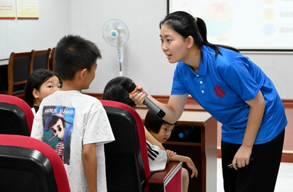 “木星是太陽系中體積最大的行星,它有近百顆衛星……”上海師范大學環境與地理科學學院的學生范欣星,正在為安徽六安舒城縣千人橋小學的孩子們帶來“遨游星河”天文課程。