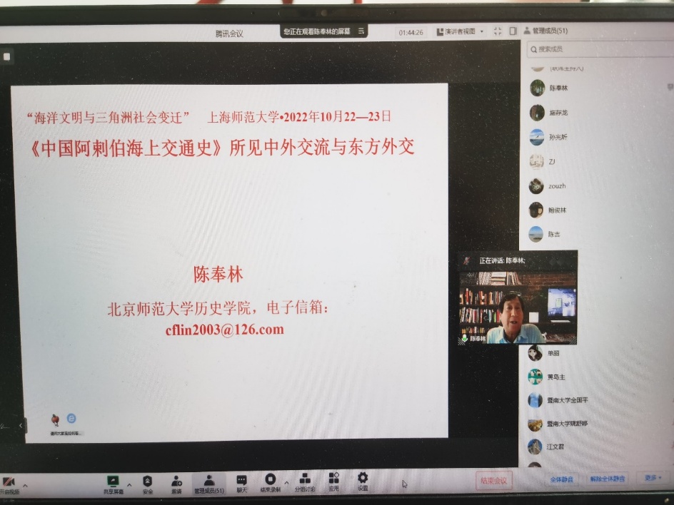 本屆研討會納入“上海市社聯(lián)第十六屆(2022)學(xué)會學(xué)術(shù)活動月”項(xiàng)目,受疫情影響,采取線上召開的形式。研討會以“海洋文明與三角洲社會變遷”為中心議題,探討世界各地河口三角洲和沿海地域歷史發(fā)展變遷與其對人類文明發(fā)展的重要意義。作為大陸通向海洋的窗口,河口三角洲天然成為海、陸文明交融的前沿,不僅具有得風(fēng)氣之先的優(yōu)勢條件,其地域發(fā)展也往往深受海洋文明之影響。與會學(xué)者們圍繞海上絲綢之路與東西方文明交流、水域環(huán)境與海洋文化認(rèn)知、涉海地圖文獻(xiàn)史料的整理研究、沿海地方與區(qū)域社會等領(lǐng)域內(nèi)的重要問題進(jìn)行廣泛而深入的討論,展示了當(dāng)下學(xué)界在海洋史研究中取得的豐厚成果。