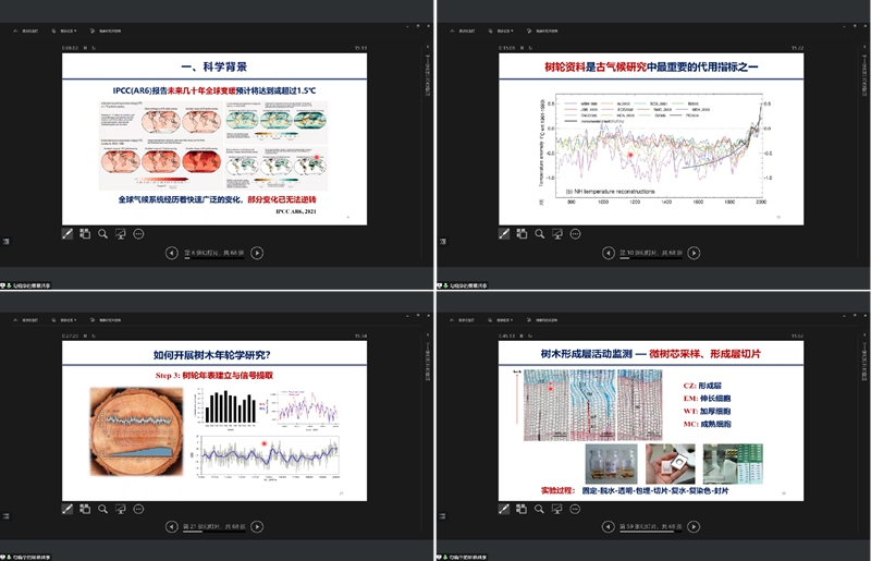 講座伊始,勾曉華教授就指出當(dāng)前全球氣溫變化顯著,人類活動(dòng)對(duì)氣候變化的影響巨大,而樹輪資料因其定點(diǎn)準(zhǔn)確、分辨率高、分布廣泛、易獲得、研究成本低等優(yōu)勢(shì)成為古氣候研究中最重要的代用指標(biāo)之一。隨后,勾教授以常見的樹輪研究指標(biāo)為引入點(diǎn)詳細(xì)為大家介紹了樹木年輪學(xué),強(qiáng)調(diào)了樹木年輪數(shù)據(jù)在考古、氣候變化、冰川變化、火山爆發(fā)、干旱、徑流、地震、火災(zāi)、蟲災(zāi)等各方面都有廣泛的應(yīng)用。講座過程中,勾教授結(jié)合自身豐富的野外調(diào)研實(shí)踐經(jīng)驗(yàn),用通俗易懂的語(yǔ)言將理論融入制作精妙的圖版中,使同學(xué)們對(duì)氣候變化歷史的研究、森林對(duì)氣候變化的響應(yīng)以及樹木生長(zhǎng)的監(jiān)測(cè)研究都有了更加深入透徹的理解。