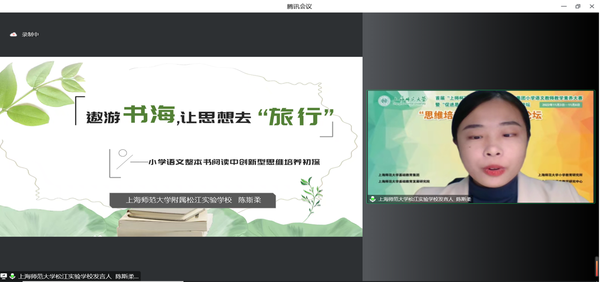 上海師范大學松江實驗學校陳斯柔老師分享了學校依托整本書閱讀活動培養學生形象和邏輯思維能力的具體做法。