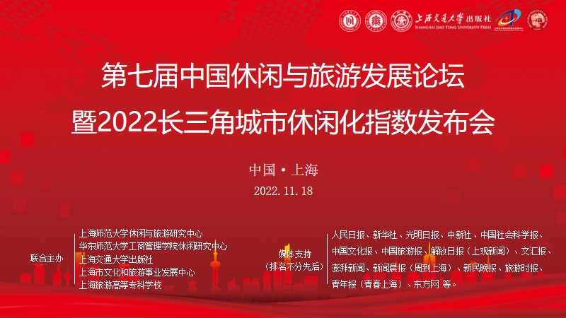 11月18日,“第七屆中國城市休閑與旅游發展論壇暨2022長三角城市休閑化指數發布會”在上海市文化和旅游事業發展中心成功舉辦。本次會議由我校休閑與旅游研究中心、華東師范大學工商管理學院休閑研究中心、上海交通大學出版社、上海市文化和旅游事業發展中心、上海旅游高等專科學校聯合主辦。來自中山大學、浙江大學、同濟大學、華東師范大學、上海師范大學、上海交通大學出版社、上海市黃浦區文旅局、上海市文化和旅游事業發展中心、上海春秋國際旅行社、世集文旅集團、上海飛瓊酒店管理有限公司等多家高校、文旅企事業單位及媒體的嘉賓參加了線下和線上發布與研討,為長三角城市休閑和旅游的發展獻計獻策。