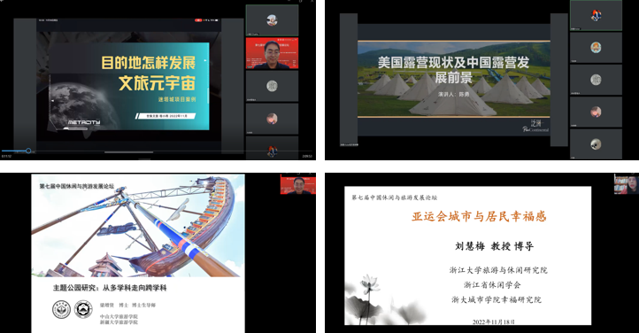 程小雨就“目的地如何玩轉元宇宙”作主題報告。她從世集文旅旗下的未來世界主題IP迷塔城入手,分析了其場景設定、商業業態等,認為迷塔城未來將帶動各領域元宇宙場景落地。陳勇以當下火爆的露營為主題作“美國露營現狀及中國露營發展前景”報告。他介紹了美國露營市場商業模式,并分析了各國不同世代與戶外露營的關系,認為國外露營企業的時尚性、文化性等特征為中國露營行業發展提供了借鑒。梁增賢長期從事主題公園方面的研究,作了“主題公園的跨學科研究可能”報告,他認為主題公園是一個邊界清晰、環境受控、市場時空規律、設施項目多元,能夠控制較多外部變量的理想旅游實驗情境,應當從地理學、管理學、心理學、旅游學等跨學科視角進行多方位研究。劉慧梅以“亞運會城市與居民幸福感”為議題作主題報告。她以即將舉辦亞運會的城市杭州為例,通過問卷調查回答了杭州城市居民相較于其他亞運城市居民是否更加幸福的問題。最后,她提出要提升居民的社會人際關系、打破小區之間的壁壘、依托新建地鐵線路,倡導工作與休閑的平衡,來提升杭州“東方休閑之都”城市品牌。