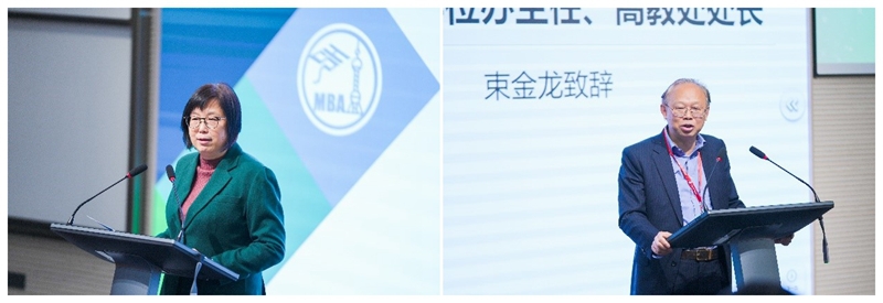 袁雯和束金龍先后致辭。袁雯指出,中國MBA教育走過了30多年,從無到有,從弱到強,成為引領了變革時代人才培養的最重要的力量之一。上海師范大學商學院作為剛剛加入上海MBA教育大家庭的新成員,非常榮幸能夠與大家一起分享上海MBA教育過去30多年來所取得的輝煌成就,但我們更愿意與大家一起站在新的起點上,以上海師范大學厚重的人文學科為底蘊,以“培養富有人文精神、積極擁抱新技術變革的管理精英”為使命,為中國和上海MBA教育事業貢獻上海師范大學的力量。