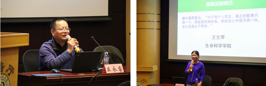 “我做過很多學術報告,但與這么多學生進行‘科學人生’的分享還是首次。”巫永睿研究員以求學科研生涯開篇,開啟了本次“科學人生”的分享。他深情回顧了在蘭州大學求學考研的艱辛之路和在中科院攻讀博士學位時自由探索與合作共贏的科研經歷;深度剖析了在湖州市掛職時思考人生規劃,決定重新投身充滿挑戰的科研之路的轉折過程;動情地回憶了在美國博士后工作期間,攜手王文琴老師在困境中的堅守與突破。巫永睿研究員真誠地建議同學們盡早規劃自己的人生,設定目標,并為之付出行動與努力。